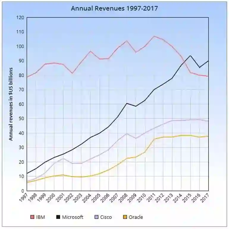 首先,IBM 已经有一段时间表现不佳了:去年的年收入是 1997 年以来的最低水平,是在郭士纳的转型过程中;当然,正如 ZDNet 的这篇文章所指出的,1997 年的 790 亿美元就是今天的 1200 亿美元。