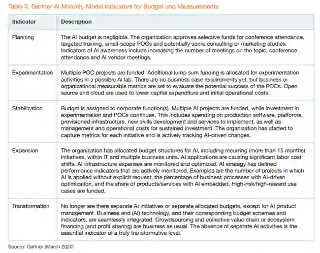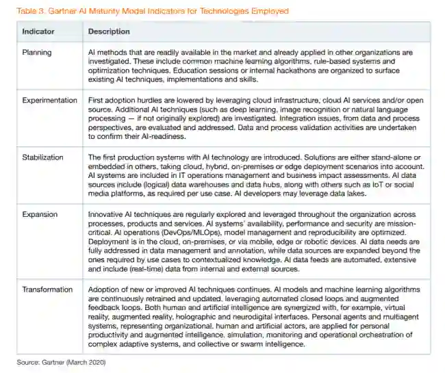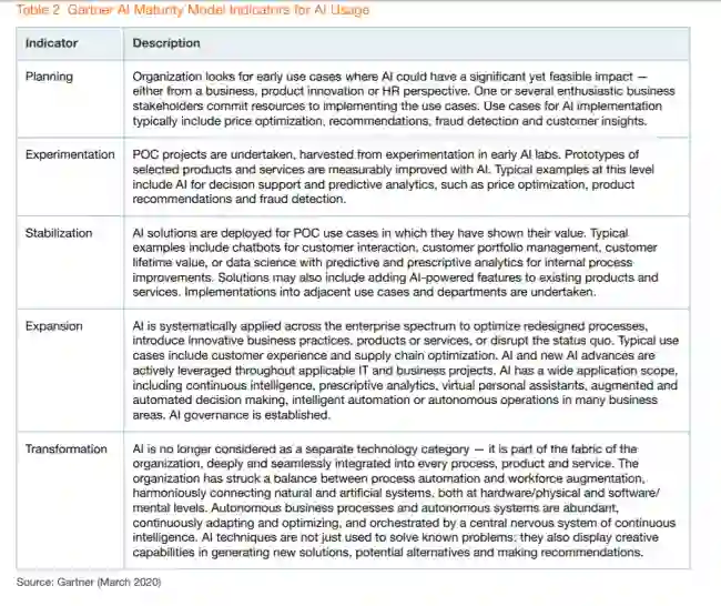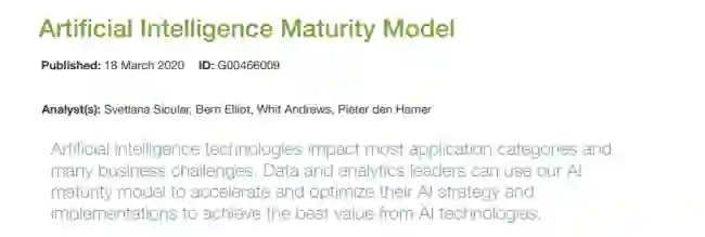 2020年3月18日,Gartner发布了题为《Artificial Intelligence Maturity Model》(人工智能成熟度模型)的报告。人工智能成熟度指标使数据和分析领导者能够用适当的技能和措施激励企业领导者,从而提供效率和创新能力。