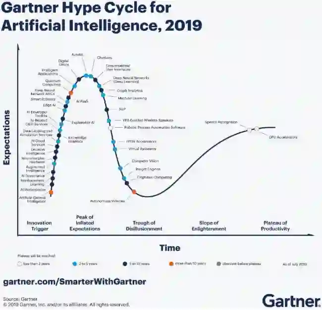 2019年7月,Gartner发布了2019年人工智能成熟度曲线,审查了在AI领域的创新和趋势潮流,以及AI计划范围。成熟度曲线中也出现了许多的新技术。