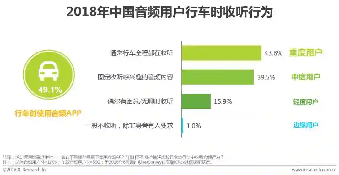 行车途中是音频重要的收听场景,在行车时,49.1%的音频用户会收听音频内容,车载音频有较大的用户使用基数。