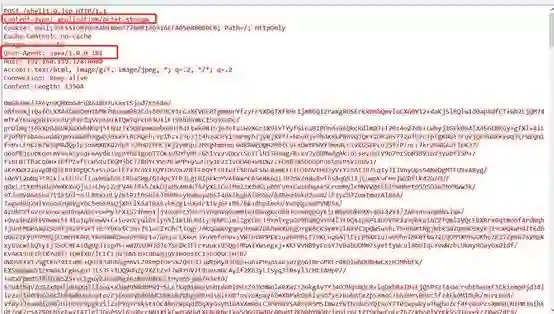 从Wireshark中抓到的数据包中可以看出,冰蝎与传统的管理工具一样,操作请求均为POST。从流量包中可以清楚看到请求头中携带的User-Agent: Java/1.8.0_181为客户端Java环境的版本且会随着客户端的Java环境而变化,Content-Type: application/octet-stream表示以二进制流传输数据,响应体的数据被加密,无法看出响应的内容是什么,Content-Type: application/octet-stream代表二进制流也不能作为判定的依据,暂时无法提取的有效的特征,但是注意到冰蝎在建立之前会有一个GET请求,咱们在最新版本中看一下会不会有这个GET请求。