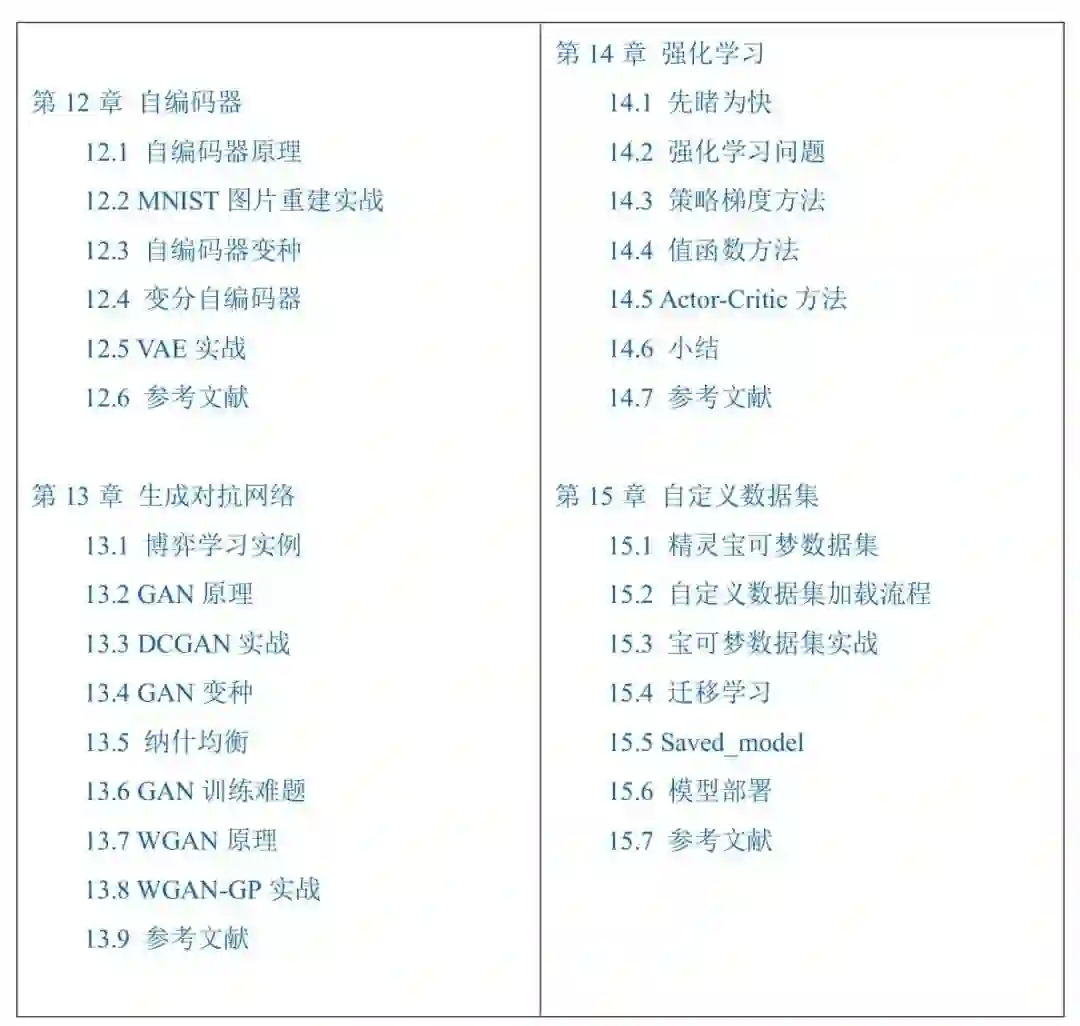 在本书中编写时,很多英文词汇尚无法在业界找到一个共识翻译名,因此作者备注翻译的英文原文,供读者参考,同时也方便读者日后阅读相关英文文献时,不至于感到陌生。尽管每天都有深度学习相关算法论文的发布,但是作者相信,深度学习的核心思想和基础理论是共通的。本书已尽可能地涵盖其中基础、主流并且前沿的算法知识,但是仍然有很多算法无法涵盖,读者学习完本书后,可以自行搜索相关方向的研究论文或资料,进一步学习。