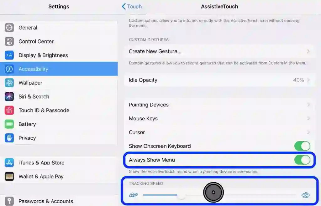 在辅助触控设置页的下面还可以调整鼠标指针移动速度,也可以选择是否始终显示菜单。