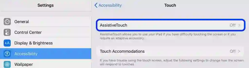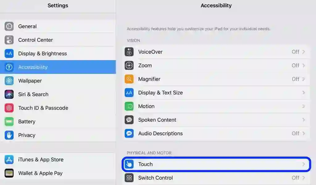 - 点击「触控」设置里的辅助触控开关将其开启;