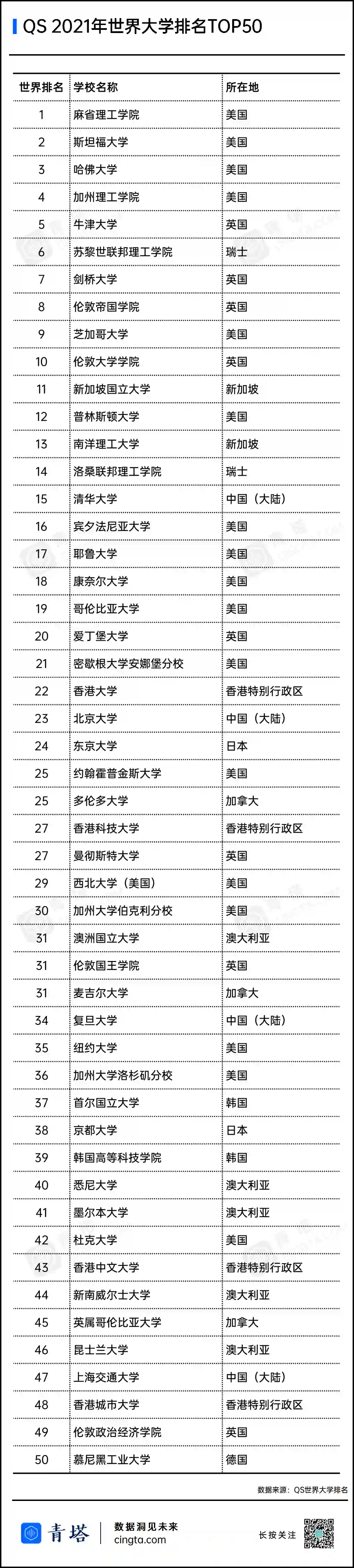 本次QS2021年世界大学排行榜的上榜学校的指标明细,可以6月10日上午10点后点击左下角的阅读原文或访问青塔网(https://www.cingta.com)查看。中国大陆上榜的51所高校如下: