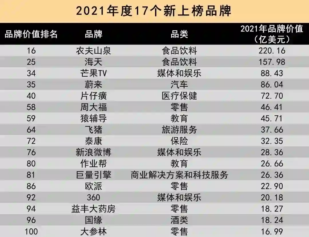 此外,今年共有 17 个新上榜品牌,农夫山泉(220 亿美元)排名第 16 位,海天(158 亿美元)排名第 25 位。今年百强榜单品牌中有超过五分之一(21 个)都实现了 100% 以上的品牌价值增长,榜单进入门槛已提升至 17 亿美元,同比增长 109%。