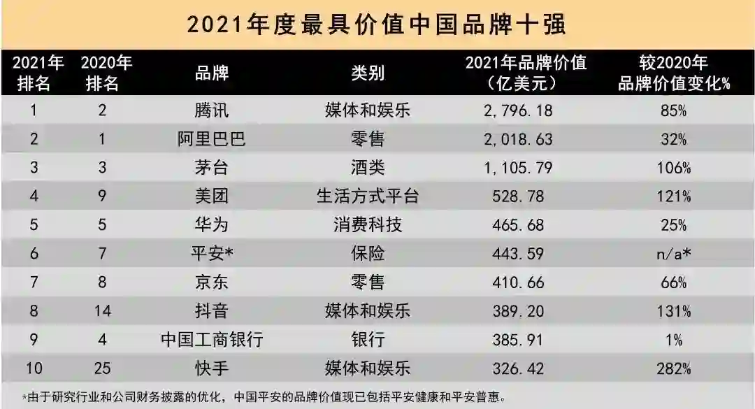 今日,凯度发布 2021 年最具价值中国品牌 100 强排行榜,最具价值的 100 个中国品牌总价值同比增长 57%,达到 1.56 万亿美元。腾讯升至百强榜首,品牌价值同比增长 85%,达到 2796 亿美元;阿里巴巴(2019 亿美元)和茅台(1106 亿美元)排名第二和第三名,今年是该榜单的第 11 次发布。