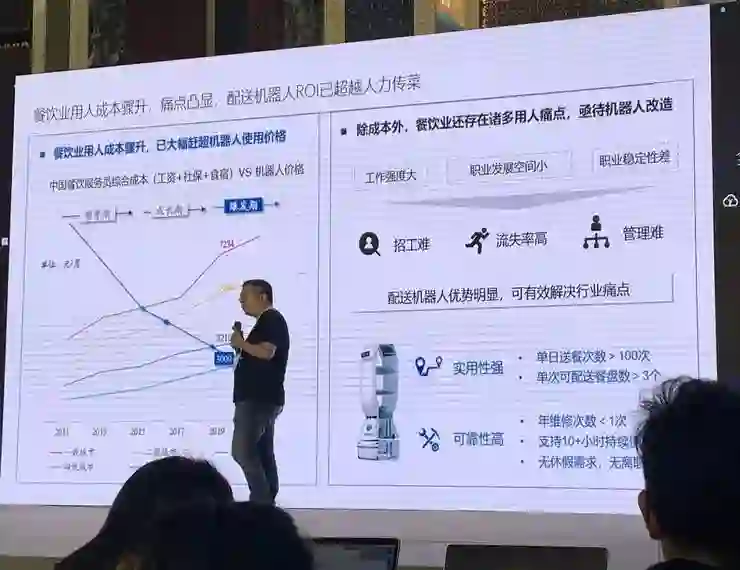 李通在演讲介绍了自己对商用机器人的理解:目前想要做出强交互的机器人是很难的,但已经可以给市场提供功能性的机器人了。而且,与工业机器人不同的是,工业企业都有自己的工程师团队,可以长期维护机器人、按需改进,但餐饮业的客户是没法单独为机器人雇工程师维护的,所以擎朗机器人带来了新的方案,他们以租代售、以运营为中心做商业机器人市场,比如以三千元每月提供机器人租赁服务,机器人本身比人力更便宜、工作时间也更长,使用机器人的企业也没有额外的后期维护支出。这样的方案可以解决餐饮业的行业痛点。他们的机器人方案如今不仅在国内超过50个餐饮品牌中得到使用,也已经出口海外,得到了海内外各界的关注。