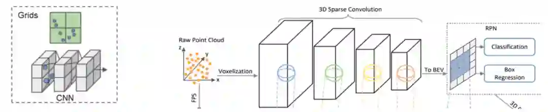 voxel-based的先驱的两篇文章voxelnet和second的主要贡献分别是第一个提出采用voxel作为网络输入的方法和引入稀疏卷积替代3D卷积。这里补充一点voxel-based方法的backbone,目前几乎所有的voxel-based方法都采用如下的encoder的backone作为特征提取器。下图左图表示的是点的voxel表示,经过Voxelization化后,经过逐步下采样的encoder过程降为二维 feature map,最后再根据二维的feature的每一个像素点作为anchor point提出候选框。