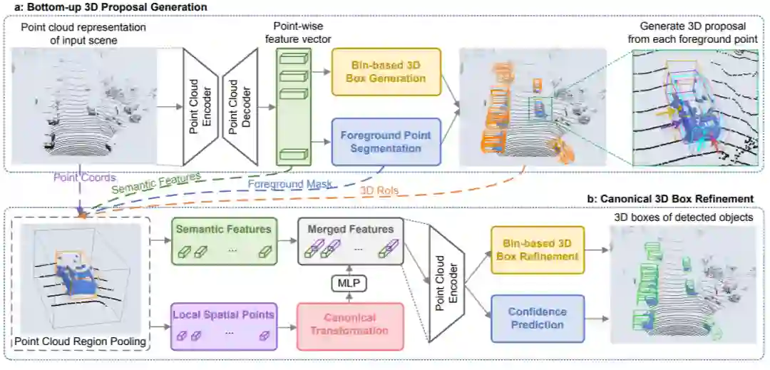 随后的CVPR19的比较经典的Point_based方法是point-rcnn,该工作不仅仅采用point作为representation,同时和上诉的F-pointnet比较没有采用二维信息,仅仅采用点云作为网络输入。如下图所示,该工作是一个两阶段的检测方法,第一阶段根据语义分割信息对每一个点都提出一个候选框,随后再采用多特征融合进一步优化proposals。