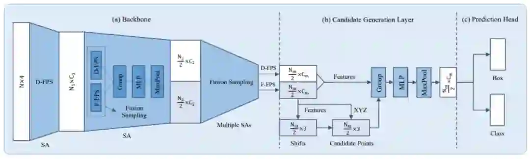 除了CVPR会议,在IROS和ICRA机器人相关的会议上也有很多这方面的研究,其中有一篇在F-pointnet上做出更细致的优化的文章F-ConvNet也是很优秀的工作,有兴趣的同学可以去了解下;这里直接介绍今年CVPR20上的基于Pointrepresentation的文章 3D-SSD,如下图所示,平平无奇的一阶段encoder过程,也就是把pointnet++的decoder部分给去除掉(这样做的目的是减少网络前馈时间,在KITTI上达到35FPS),本文的最主要的贡献点在于将Pointnet++的采样方法由欧式空间度量改为特征空间度量和欧式空间度量相结合的方法,同样的也采用了anchor-free的设计方法,使得显存占用更少。