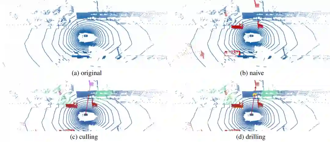 笔者再介绍一篇今年CVPR20上涉及到gt augmentation的工作(oral)(What You See is What You Get:Exploiting Visibility for 3D Object Detection),,如下图,在本文gt数据增广后,俯视图下由(a)变成了(b),但是作者指出这里出现的问题在于有的增广的物体出现在墙后,这在Lidar扫描过程中是不符合规律的,因此作者采取的增广策略是把对应的墙体去掉,如(d)图所示的内容。这就比较符合lidar扫描的特性,即遇到object就会反弹。