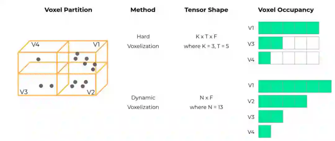 在voxel划分上做研究的工作还有如下的waymo组的MVF工作,可以看到,之前的研究工作如果对于一个voxel中点数没有占据max_points_number实际上也会采用全0占据空间,而这一篇文章的一点创新则是修改成可自适应的储存点,不必强行每个voxel的空间占用一样大,可以节省不少内存占用。