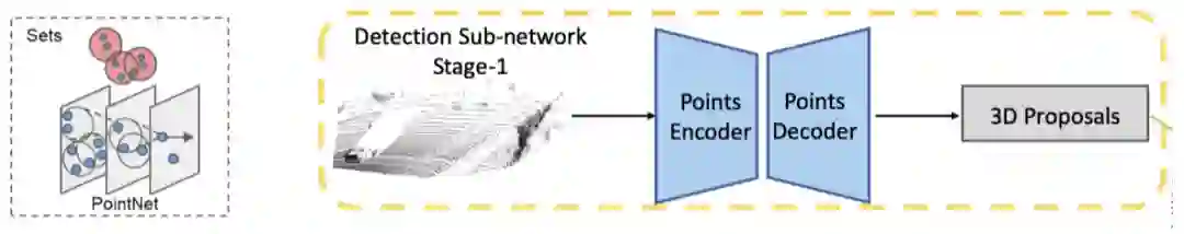 这里首选插入一点采用point-based方法的基础backbone,如下所示,左图表示的是pointnet的特征提取结构,也就是point-based的基础模块,右图就是point-based方法的基础架构,由point-encoder层和point-decoder层组成,encoder层主要逐渐下采样采点特取语义信息,decoder过程是将encoder过程得到的特征信息传递给没有被采样到的点。使得全局的点都具有encoder的特征信息。最后再通过每个点作为anchor提出候选框。