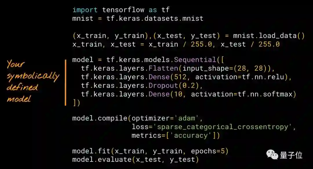 听起来很陌生?其实只要用过Keras,你应该也做过这样的事。这里有一个简单的示例,借助Keras Squential API,用符号来搭建模型: