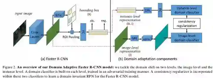 (1)熟悉Unsupervised Domain Adaptation的同学可能知道,这篇文章主要借鉴了[3]的核心思想,并将其成功应用于目标检测领域,是利用对抗思想解决目标检测任务中域适配问题的一次成功探索。此外本文一作还有一篇论文被CVPR2018接收,将对抗思想用于解决语义分割中的域适配问题,详见[4]。