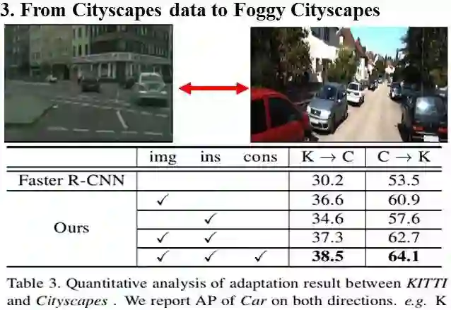 从上图可以发现,左图是Cityscape数据集,右图是KITTI数据集,通过本文的域适配,无论是Cityscape到KITTI还是从KITTI到Cityscape,检测器都有显著提升。