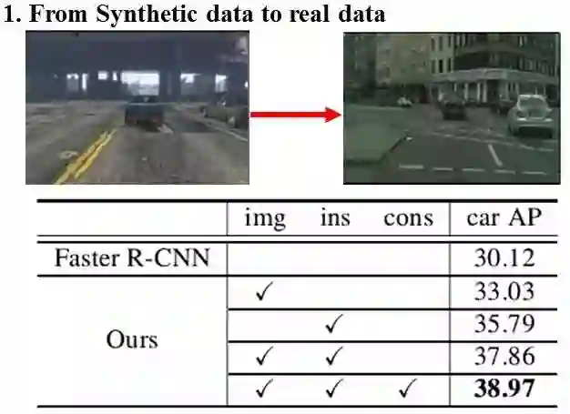 从上图可以发现,左图是合成数据集SIM 10k,右图是真实场景Cityscape数据集,通过本文的域适配,即使没有使用Cityscape中的标签数据进行训练,检测器性能提升了约8%。
