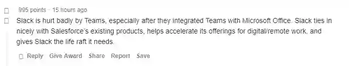 Slack被微软Teams伤得很重,尤其是在微软将Teams与Office整合之后。Slack与Salesforce现有的产品可以有机地结合在一起,这有助于加速Salesforce数字远程工作的产品的布局,同时也给Slack提供了它急需的救生筏。