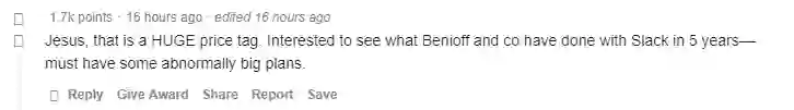 天啊,价格标的真的非常高了。我倒是想看看贝尼奥夫和他的团队在5年内要对Slack做什——他们一定在下一盘大棋。