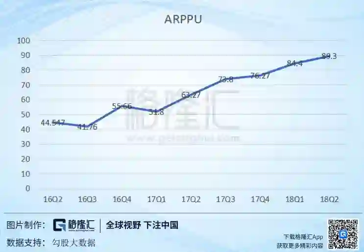 陌陌直播业务的ARPPU也呈现增长的趋势,从16Q2的44.5美元增长到18年Q2的99.3美元。