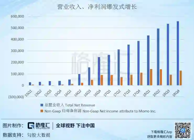陌陌2018年营收为19.5亿美元,同比增长51%,Non-GAAP归母净利润为5亿美元,增长39%。Q4 营收 5.6亿美元,同比增长45%,non-gaap 归母净利润为1.3亿美元,同比增长17%。截止至美东时间周一收盘,陌陌股价为34.36美元,对应P/E TTM为17x,市销率P/S为3.58x。