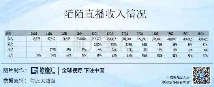 在18Q4,直播业务的收入达到4.3亿美元,同比增长31%,环比增长6%,占了陌陌总收入的77%,最巅峰的时候直播业务的占比达到85%。