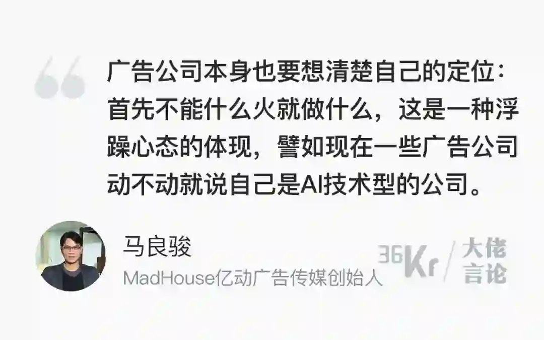 “广告公司如果不快速推进变革,有沦为垫款公司的风险”,时趣CEO张锐告诉36氪,Madhouse亿动广告传媒创始人马良骏也表达了对于广告公司有可能沦为“供应链金融公司”的担忧。