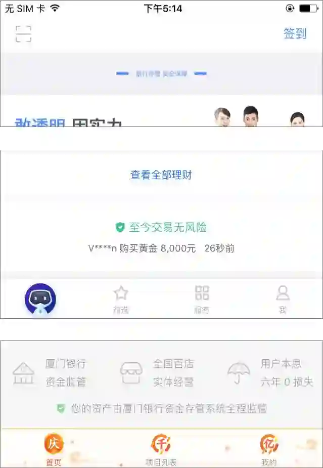 在视觉层面的设计,除了首页首屏,还可以从某些细节入手。如在下拉刷新时,出现提现安全的字样或元素;如下图某平台的“银行存管 安全保障”字样。