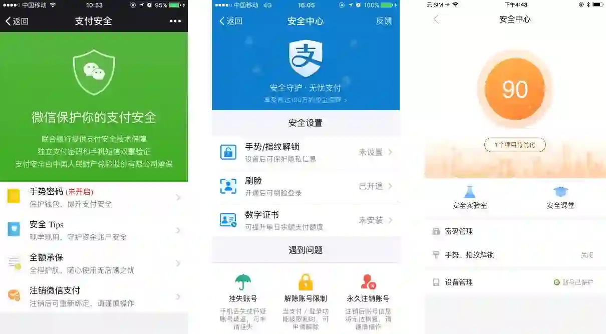 下图从左到右分别为微信、支付宝和铜板街APP的安全中心。