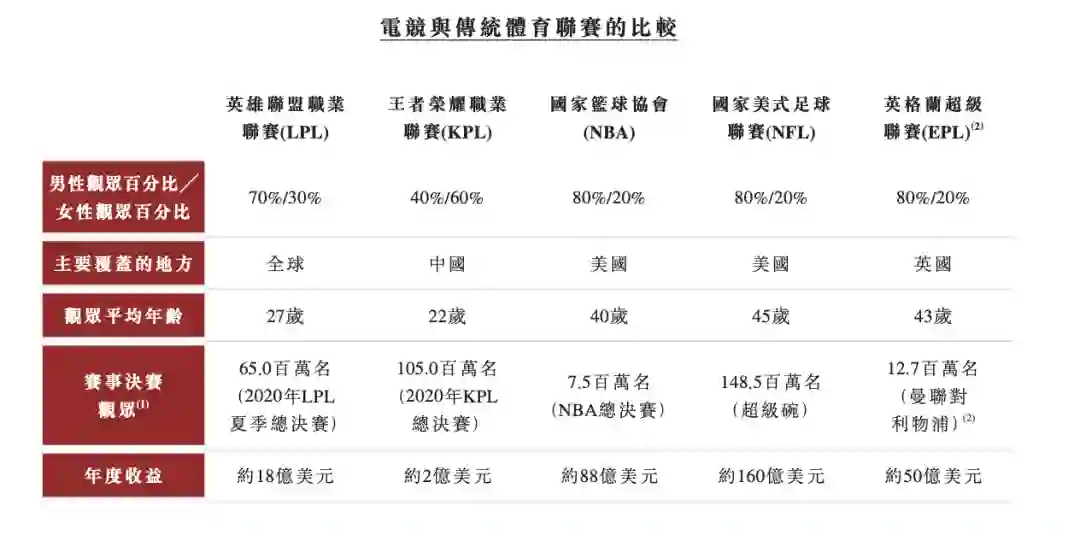 英雄体育在招股书中,将电竞与传统体育赛事作了多方面对比。通过几组关键数字的差异,可以发现电竞商业化仍处于初期阶段。