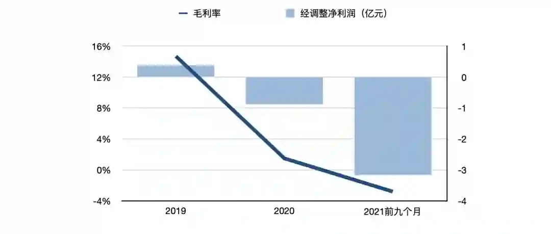 毛利方面,公司2019年毛利率为14.7%,但2020年骤降至1.5%,去年前九个月,销售成本超过营收,毛利率跌至-2.8%。