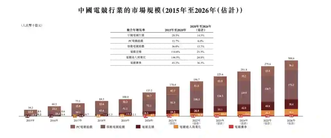 根据弗若斯特沙利文报告,2015年至2020年,中国电竞行业市场规模从392亿元增长至了1372亿元,年复合增长率达28.5%。
