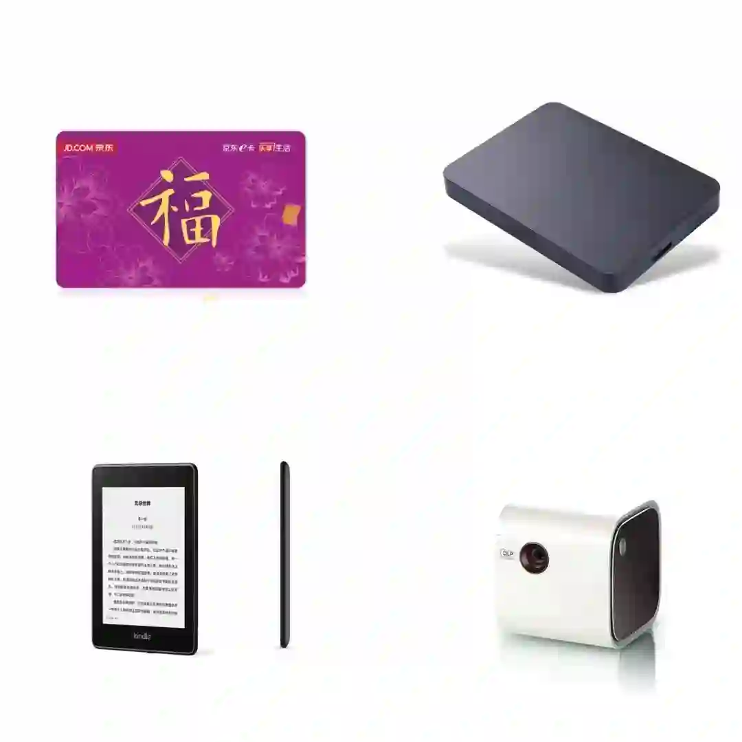 京东礼品卡×7 2T移动硬盘×1 Kindle×1 投影仪×1 |