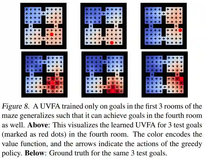价值函数是强化学习系统中的核心要素。主要思想就是建立一个单一函数近似器V(s;θ),通过参数θ来估计任意状态s的长期奖励。在这篇论文中,我们提出了通用价值函数近似器(UVFAs)V(s, g;θ),不仅能生成状态s的奖励值,还能生成目标g的奖励值。