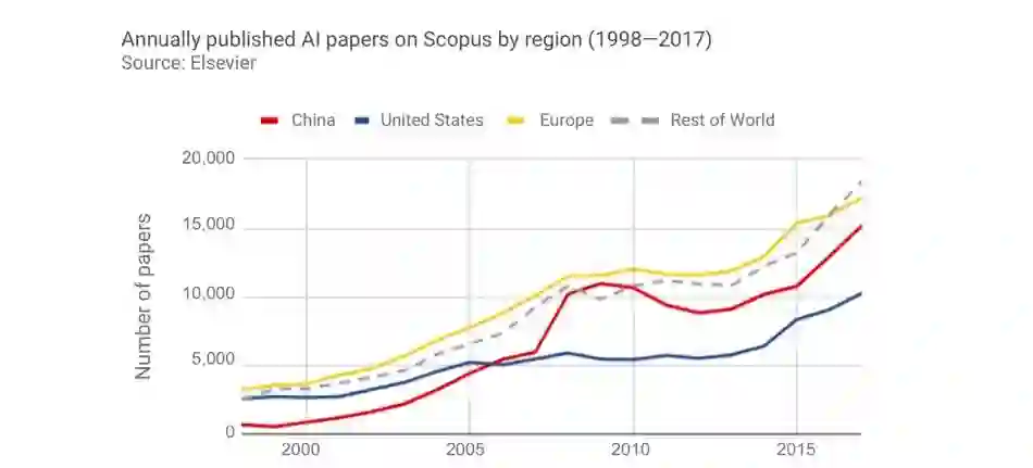2) 与人工智能和计算机科学相关的研究论文数据激增。令人惊讶的是,欧洲是人工智能论文的最大来源,在2017年Scopus*的摘要和引文数据库中,欧洲论文占人工智能论文的28%。在arXiv**上发表的AI论文数量在2010年至2017年间增长了12倍以上。