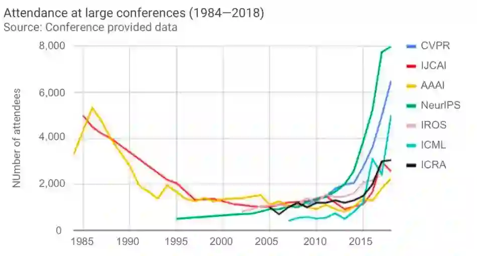 3)参加大型人工智能会议的人数激增。在大型会议中,NeurIPS (曾用名NIPS) 、CVPR和ICML,是参与人数最多的三大AI会议。自2012年以来,论参与人数的增长率,这三者也领先于其他会议,分别增长了4.8倍、6.8倍和3.5倍。