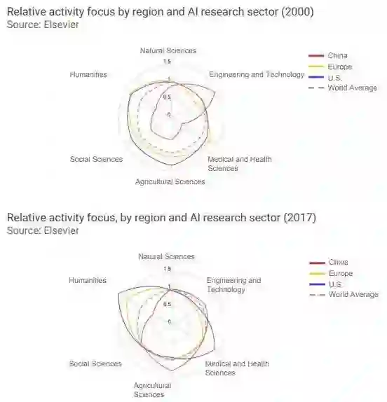 可以看出,2000 年中国的工程、技术研究活跃程度高于平均水平,但医疗健康、农业、社会科学、人道主义方面的研究活跃度比较低。到了 2017 年,这几个领域活跃程度有所提高,其中最突出的是农业科学。
