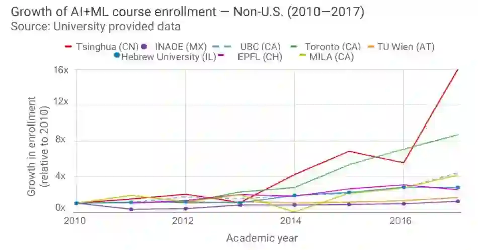 5) 中国在人工智能研究和教育方面付出了巨大的努力,追赶速度惊人。2017年,清华大学人工智能和机器学习课程的注册人数是2010年的16倍。2016年,中国人工智能论文作者被引用的次数比2000年增加了44%。2018年提交给美国人工智能协会(AAAI)会议的论文中,约有70%来自中国或美国。中国对机器人技术也表现出了极大的兴趣,2017年,中国ROS.org网站的总浏览量是2012年的18倍。