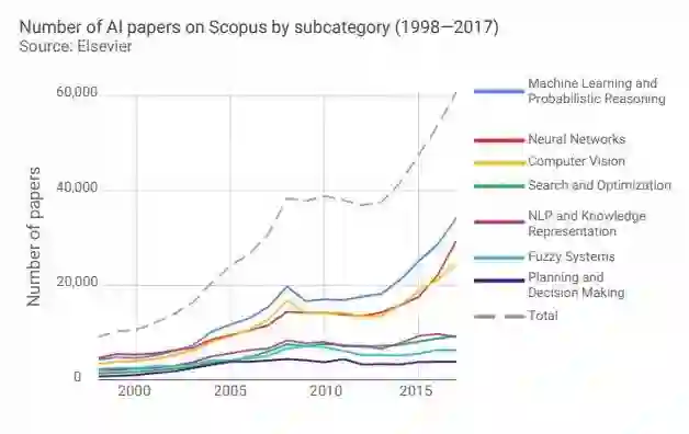 Scopus上的 AI 论文中,可以看出,机器学习和概率推理、神经网络、计算机视觉方面的论文最多,增张速度也最快,反映了这些领域的火热程度。