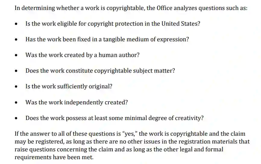 美国版权局于2021年1月颁布了一份名为《Copyrightable Authorship: What Can Be Registered?》的指导性文件,在文件中,他们对一份作品是否有版权做了如下规定: