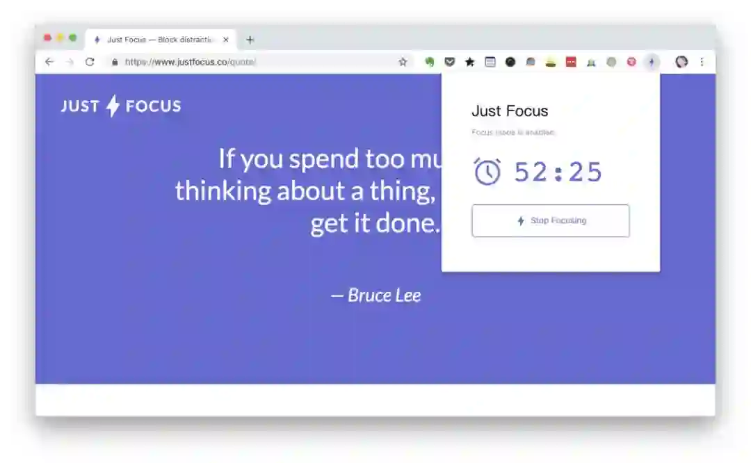 有时,我只想上网查查资料,双手却不受控制地打开了其它网站,甚至会有工作 5 分钟,摸鱼 2 小时的情况发生。而 Just Focus 则可以为你临时屏蔽这些网站,并记录专心时间。如果你工作期间尝试访问黑名单网站,就会被跳转至 Just Focus 官网,欣赏名人名言。