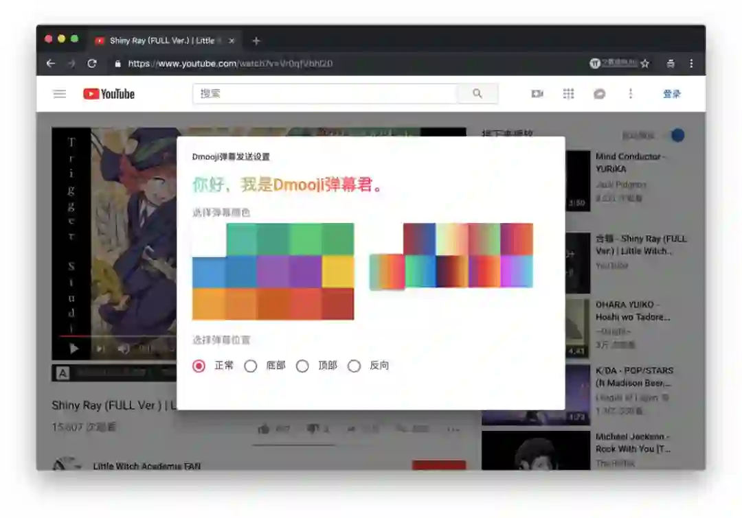 安装 Dmooji 后,你会发现 YouTube 视频进度条下方多了一块似曾相识的区域。只需用 Google 或 Facebook 账户登录,你就能够自由发送弹幕了。除了基础样式外,Dmooji 还支持设置弹幕位置,并发送彩色、渐变和反向弹幕。
