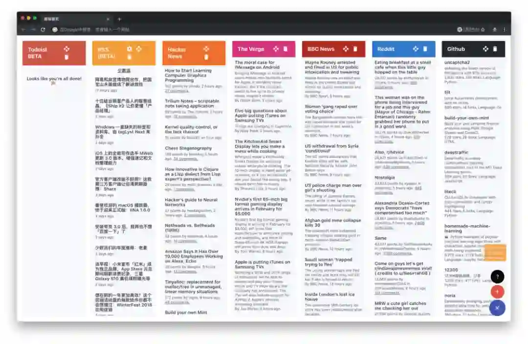 在 macOS 中,⌘Command-↹Tab 快捷键可以让你在多个窗口间快速切换,而 ctrl tab 的名字也源自于此。你可以利用它将 RSS、GitHub、Hacker News、BBC、Reddit 等数十个订阅源及 Todoist 等效率工具汇聚在一起,在新标签页纵览时事。