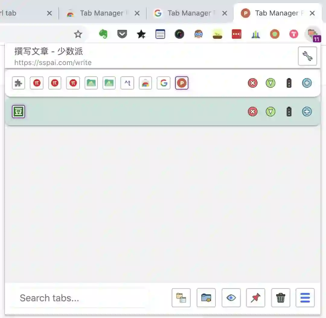 Tab Manager Plus 同样是一款标签页管理扩展,它可以将所有标签页以图标或列表的形式排列,并允许你快捷固定、新建、关闭、搜索等。你还可以用颜色区分不同窗口,更加直观。