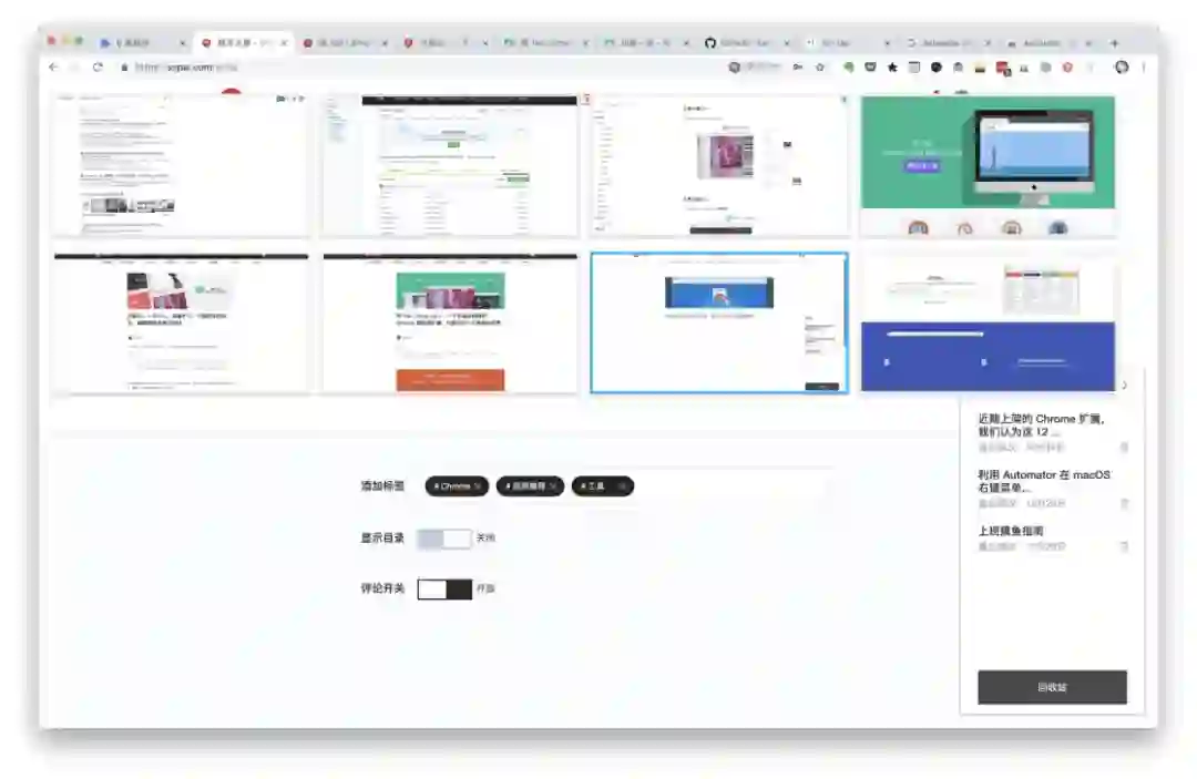 Chrome 对于多标签页的处理实在不够友好,稍微多一点,标签页就都挤成一团,完全无法分辨。为了解决这个问题,不妨试试 Astrolabe,它可以生成当前打开的所有标签页的缩略图,点击即可切换,一目了然。