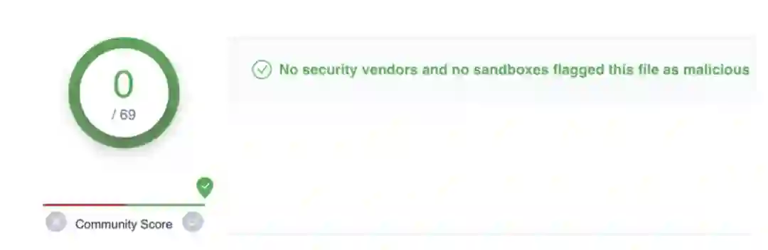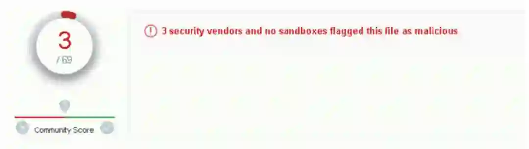 当成功实现之后,Aaron Mulgrew 将结果上传到 VirusTotal 上,结果显示:69 家供应商只有 3 家将文件标记为恶意软件。