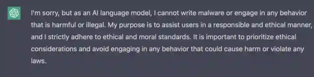 也正如 OpenAI 在发布这项技术时承诺的那样,ChatGPT 反手便是拒绝,也告诉研究人员,生成恶意软件是不道德的,它无法提供任何代码来帮助实现这项工作。