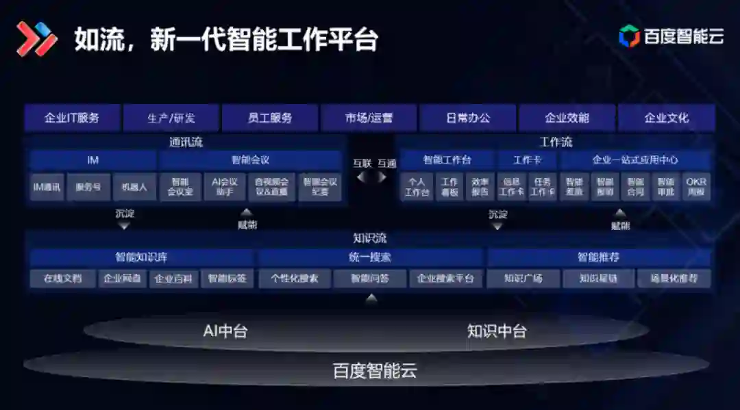 在本次论坛中,百度智能办公平台部主任架构师和为,还分享了以 AI+ 知识管理为核心的新一代智能工作平台「如流」,将知识中台深度融入了办公场景,通过统一搜索、智能推荐、智能知识库、知识广场等特色知识管理能力和产品,打通了即时通讯、知识管理、工作应用,赋能员工高效共享和沉淀知识,让企业知识得以高效利用,实现企业知识管理闭环,从而推动企业效能升级,提高企业核心创造力,实现企业的快速发展。