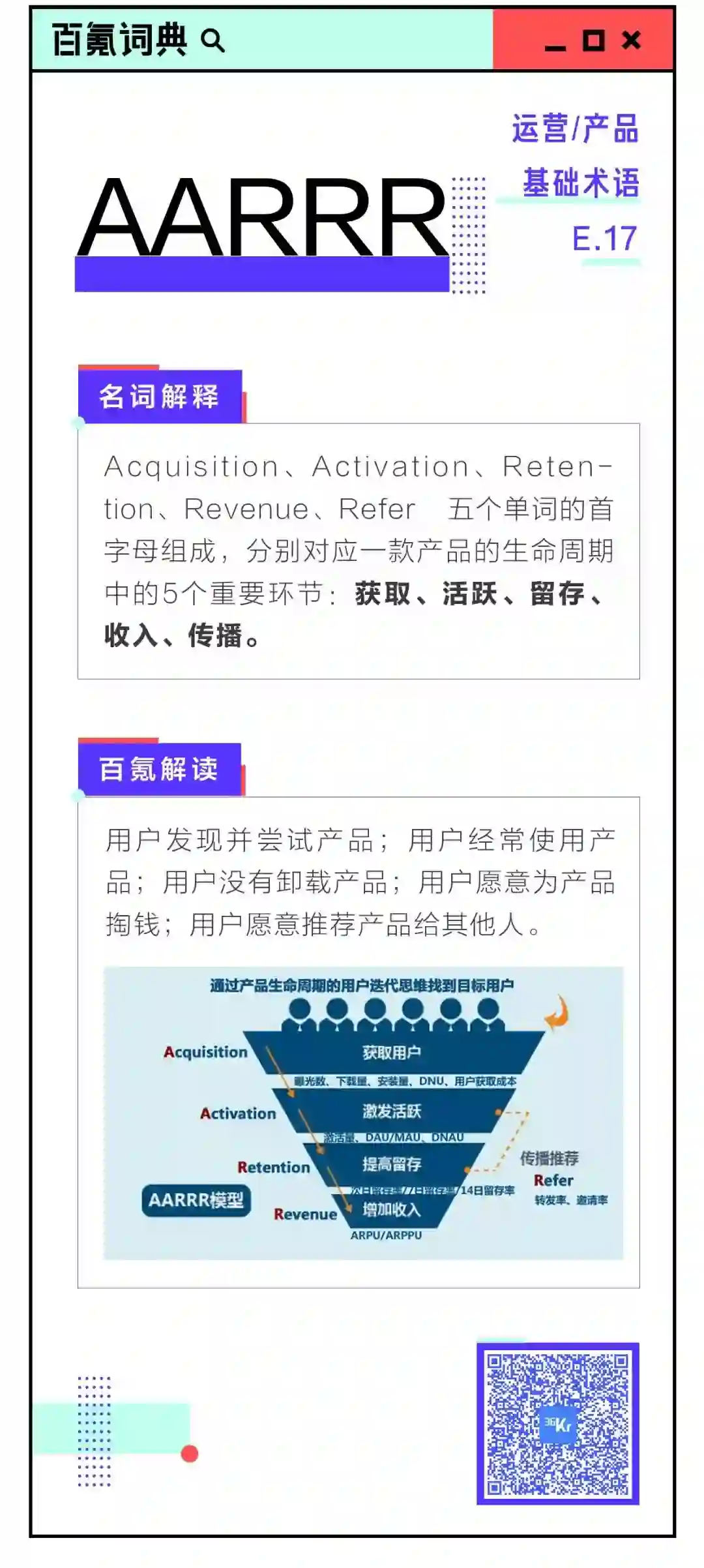 36氪「百氪词典」第五期——「运营、产品基础术语」正式上线,用易懂的方式解读常用的互联网专业术语,丰富你的知识储备。今日解释词为「AARRR」,上期解释词为「PM」,识别图中二维码,获取往期内容。